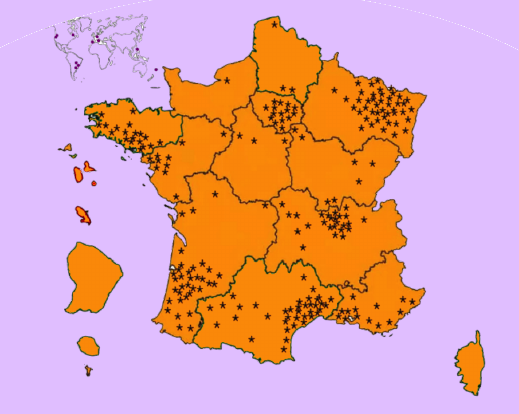 En voici la répartition géographique (une étoile peut représenter plusieurs établissements géographiquement très proches).