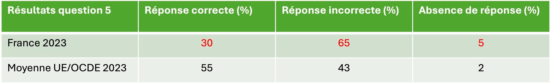 Voici les questions posées aux élèves de fin de quatrième lors de l'étude internationale TIMMS en 2023, dont les résultats ont été publiés en décembre 2024, ainsi que le pourcentage de bonnes-mauvaises réponses de la France par rapport aux autres pays.
